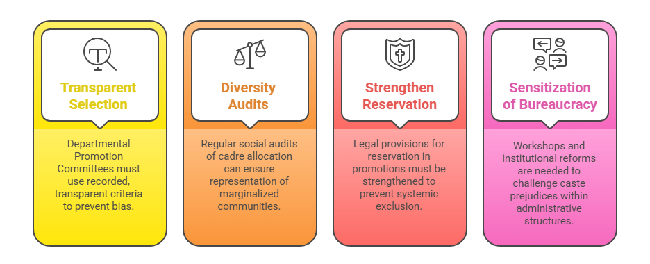 - Strengthening Reservation in Promotions: Legal provisions for reservation in promotions must be strengthened to prevent systemic exclusion.