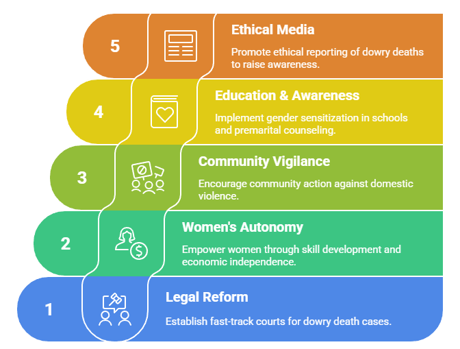 - Legal Reform + Speedy Justice: Establish fast-track courts for dowry death cases.