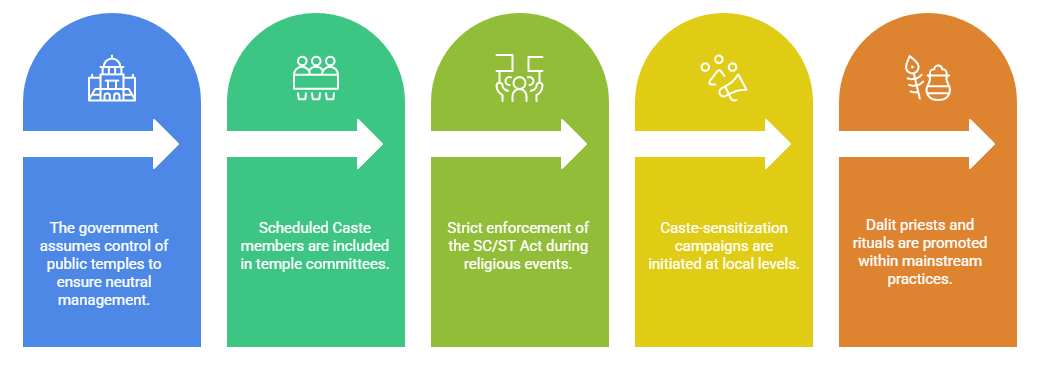 Temples historically functioned to uphold the Varna system. Denial of access to SCs preserved hierarchical equilibrium but is dysfunctional in modern democratic India. Intersectionality in ExclusionThe denial of temple entry is not experienced uniformly. Dalit women, for instance, face double exclusion—as untouchables and as women. Cases of sexual violence, social boycott, and humiliation are more severe when women assert their right to temple access. Role of the State and Civil SocietyWhile legal reforms exist, their enforcement is often weak. Dominant castes control temple committees, police fail to act, and political will is often absent. However, civil society groups, Dalit rights organizations, and progressive religious leaders have made significant contributions in mobilizing support. Suggested Measures: